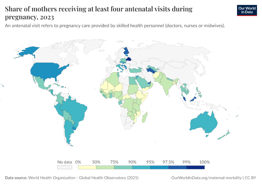 World Health Organization - Global Health Observatory (2025) – processed by Our World in Data. “Share of mothers receiving at least four antenatal visits during pregnancy” [dataset]. World Health Organization, “Global Health Observatory” [original data]. Retrieved March 4, 2026 from https://refactor-hide-legend.owid.pages.dev/grapher/share-of-mothers-receiving-at-least-four-antenatal-visits-during-pregnancy