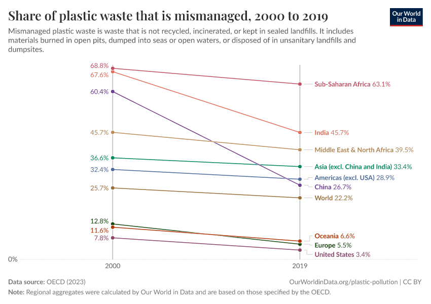 “Data Page: Share of plastic waste that is mismanaged”, part of the following publication: Hannah Ritchie, Veronika Samborska, and Max Roser (2023) - “Plastic Pollution”. Data adapted from OECD. Retrieved from https://refactor-hide-legend.owid.pages.dev/grapher/share-of-plastic-waste-that-is-mismanaged [online resource]How to cite this data