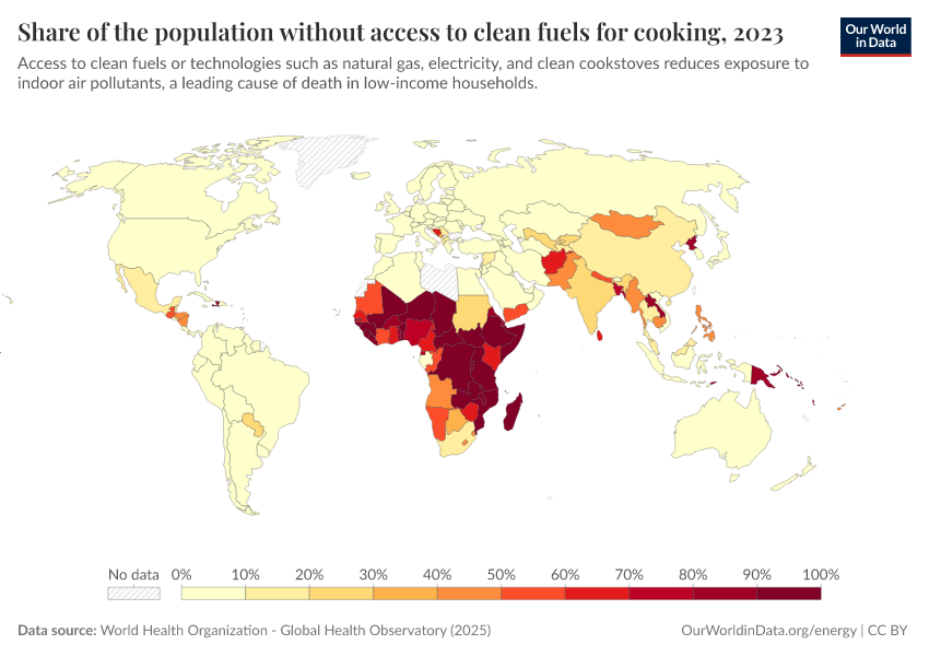 World Health Organization - Global Health Observatory (2025) – processed by Our World in Data. “Share of the population without access to clean fuels for cooking” [dataset]. World Health Organization, “Global Health Observatory” [original data]. Retrieved March 4, 2026 from https://refactor-hide-legend.owid.pages.dev/grapher/share-of-the-population-without-access-to-clean-fuels-for-cooking