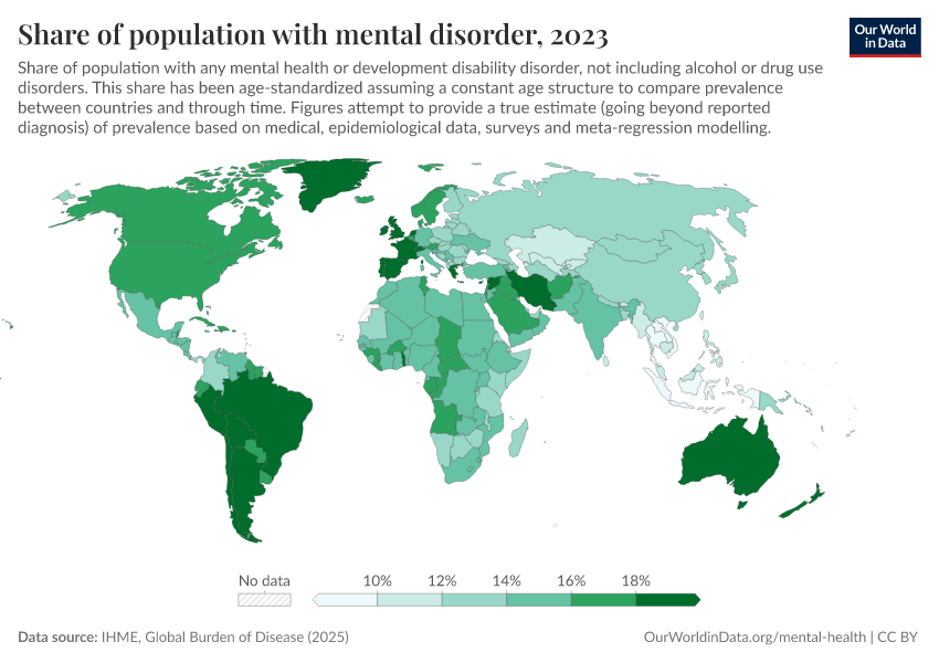 IHME, Global Burden of Disease (2025) – with major processing by Our World in Data. “Share of population with mental disorder” [dataset]. IHME, Global Burden of Disease, “Global Burden of Disease - Mental Health Prevalence” [original data]. Retrieved March 4, 2026 from https://refactor-hide-legend.owid.pages.dev/grapher/share-with-mental-health-or-development-disorder