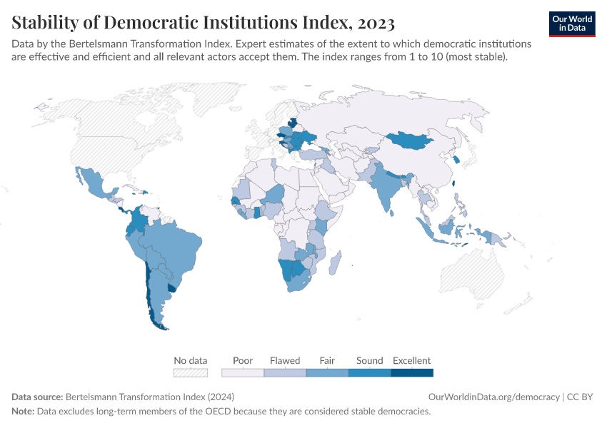 “Data Page: Stability of Democratic Institutions Index”, part of the following publication: Bastian Herre, Lucas Rodés-Guirao, and Esteban Ortiz-Ospina (2013) - “Democracy”. Data adapted from Bertelsmann Transformation Index. Retrieved from https://refactor-hide-legend.owid.pages.dev/grapher/stability-democratic-institutions-index-bti [online resource]How to cite this data
