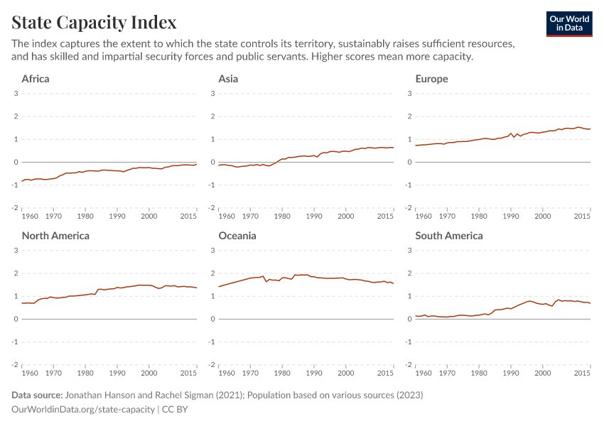 “Data Page: State Capacity Index”, part of the following publication: Bastian Herre and Pablo Arriagada (2023) - “State Capacity”. Data adapted from Jonathan Hanson and Rachel Sigman, Various sources. Retrieved from https://refactor-hide-legend.owid.pages.dev/grapher/state-capacity-index [online resource]