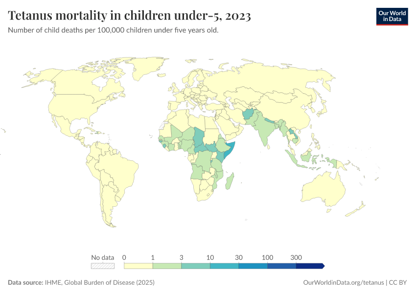 IHME, Global Burden of Disease (2025) – with major processing by Our World in Data. “Tetanus mortality in children under-5” [dataset]. IHME, Global Burden of Disease, “Global Burden of Disease - Deaths” [original data]. Retrieved March 4, 2026 from https://refactor-hide-legend.owid.pages.dev/grapher/tetanus-mortality-in-children-under-5