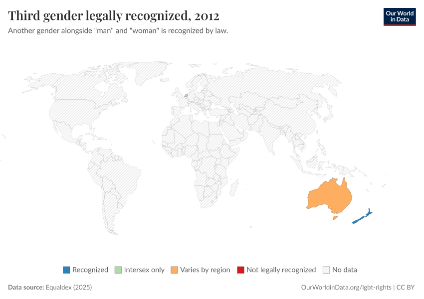 “Data Page: Third gender legally recognized”, part of the following publication: Bastian Herre and Pablo Arriagada (2023) - “LGBT+ Rights”. Data adapted from Equaldex. Retrieved from https://refactor-hide-legend.owid.pages.dev/grapher/third-gender-recognition-equaldex [online resource]How to cite this data