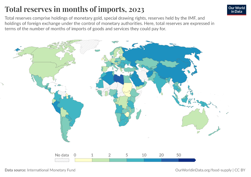 International Monetary Fund – processed by Our World in Data. “Total reserves in months of imports” [dataset]. International Monetary Fund, “International Monetary Fund, International Financial Statistics and data files.” [original data]. Retrieved March 4, 2026 from https://refactor-hide-legend.owid.pages.dev/grapher/total-reserves-in-months-of-imports