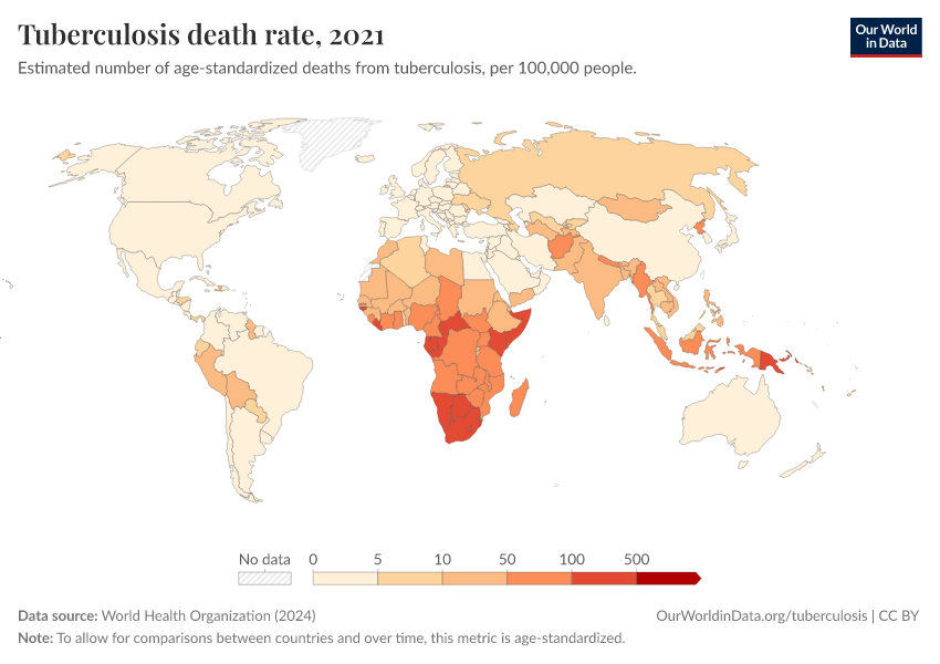 World Health Organization (2024) – with major processing by Our World in Data. “Tuberculosis death rate” [dataset]. World Health Organization, “Global Health Estimates” [original data]. Retrieved March 4, 2026 from https://refactor-hide-legend.owid.pages.dev/grapher/tuberculosis-death-rate-age-standardized