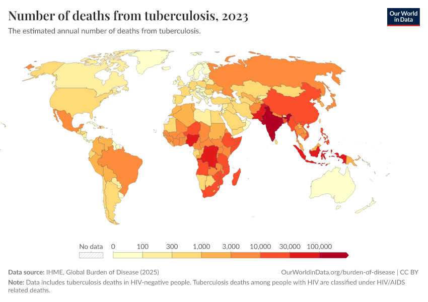 IHME, Global Burden of Disease (2025) – with major processing by Our World in Data. “Number of deaths from tuberculosis” [dataset]. IHME, Global Burden of Disease, “Global Burden of Disease - Deaths” [original data]. Retrieved March 4, 2026 from https://refactor-hide-legend.owid.pages.dev/grapher/tuberculosis-deaths