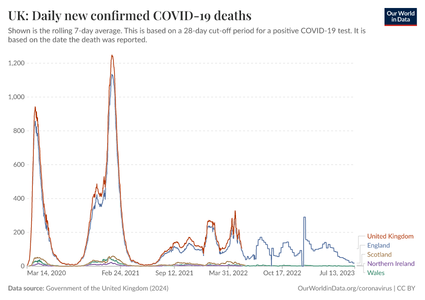 Government of the United Kingdom (2024) – with minor processing by Our World in Data. “UK: Daily new confirmed COVID-19 deaths” [dataset]. Government of the United Kingdom, “UKHSA data dashboard” [original data]. Retrieved March 4, 2026 from https://refactor-hide-legend.owid.pages.dev/grapher/uk-daily-covid-deaths