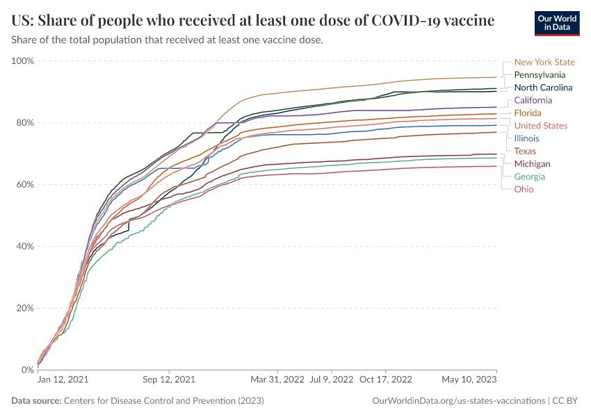 Centers for Disease Control and Prevention (2023) – processed by Our World in Data. “US: Share of people who received at least one dose of COVID-19 vaccine” [dataset]. Centers for Disease Control and Prevention, “COVID-19, Vaccinations (United States)” [original data]. Retrieved March 4, 2026 from https://refactor-hide-legend.owid.pages.dev/grapher/us-covid-19-share-people-vaccinated