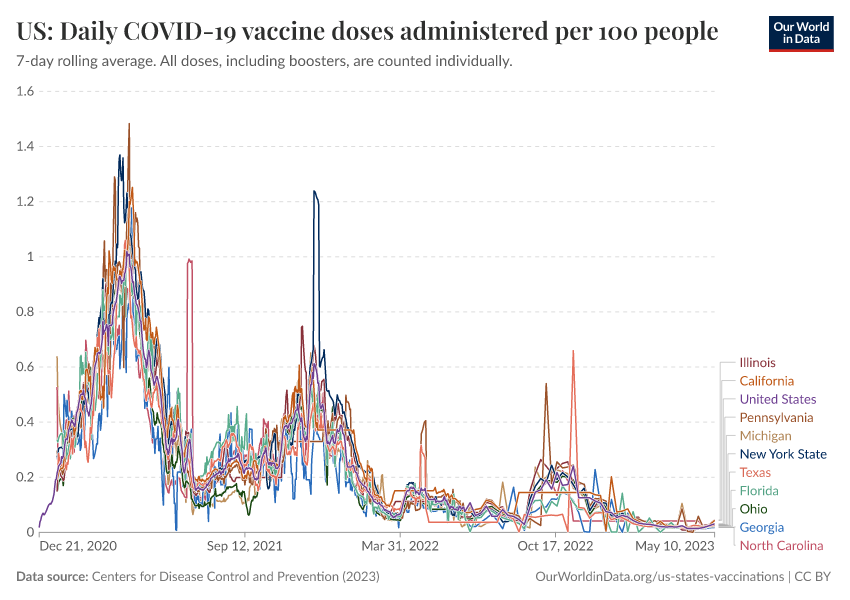 Centers for Disease Control and Prevention (2023) – processed by Our World in Data. “US: Daily COVID-19 vaccine doses administered per 100 people” [dataset]. Centers for Disease Control and Prevention, “COVID-19, Vaccinations (United States)” [original data]. Retrieved March 4, 2026 from https://refactor-hide-legend.owid.pages.dev/grapher/us-daily-covid-vaccine-doses-per-100
