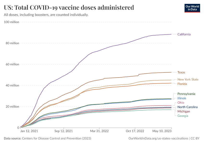 “Data Page: US: Total COVID-19 vaccine doses administered”, part of the following publication: Edouard Mathieu, Hannah Ritchie, Lucas Rodés-Guirao, Cameron Appel, Daniel Gavrilov, Charlie Giattino, Joe Hasell, Bobbie Macdonald, Saloni Dattani, Diana Beltekian, Esteban Ortiz-Ospina, and Max Roser (2020) - “COVID-19 Pandemic”. Data adapted from Centers for Disease Control and Prevention. Retrieved from https://refactor-hide-legend.owid.pages.dev/grapher/us-total-covid-19-vaccine-doses-administered [online resource]How to cite this data