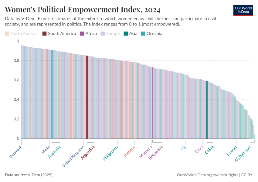 “Data Page: Women's political empowerment index”, part of the following publication: Bastian Herre, Lucas Rodés-Guirao, and Esteban Ortiz-Ospina (2013) - “Democracy”. Data adapted from V-Dem. Retrieved from https://refactor-hide-legend.owid.pages.dev/grapher/women-political-empowerment-index [online resource]How to cite this data