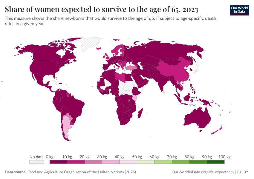 “Data Page: Share of women expected to survive to the age of 65”. Our World in Data (2026). Data adapted from United Nations Population Division (World Population Prospects), via World Bank. Retrieved from https://refactor-hide-legend.owid.pages.dev/grapher/women-survival-to-age-65 [online resource]How to cite this data