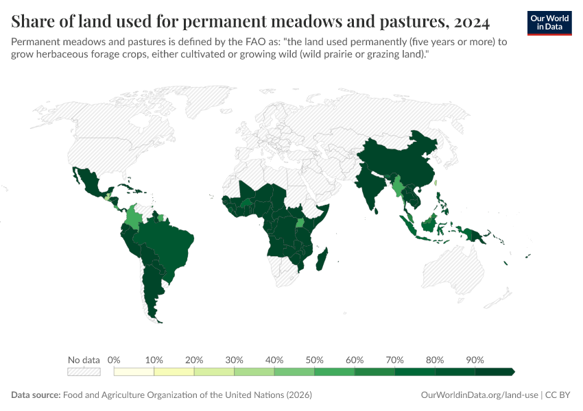 For most countries, the majority of agricultural land is used for livestock rearing in the form of pastureland. In the map here we see the share of permanent meadow and pasture as a percentage of total land area.