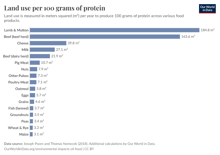 At the bottom of the scale, we see that cereal crops typically have a small land impact per unit of protein (although such protein is often lacking in some essential amino acids). At the upper end of the spectrum, we find meat products, with the land required for beef or mutton up to 100 times larger than cereals. However, it's important to note the differences in land required across the meat products: poultry and pork have a land footprint 8-10 times lower than that of beef. This means individuals can make notable reductions in the environmental impact of their diets simply by substituting lower-impact meat products for beef, lamb or mutton.