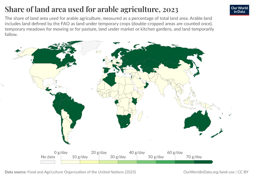 There are two main uses of agricultural land: arable farming (which is land dedicated to growing crops) and pastureland (which includes meadows and pastures used for livestock rearing). In the chart here we see a global map of land used for arable agriculture (as a share of total land area).