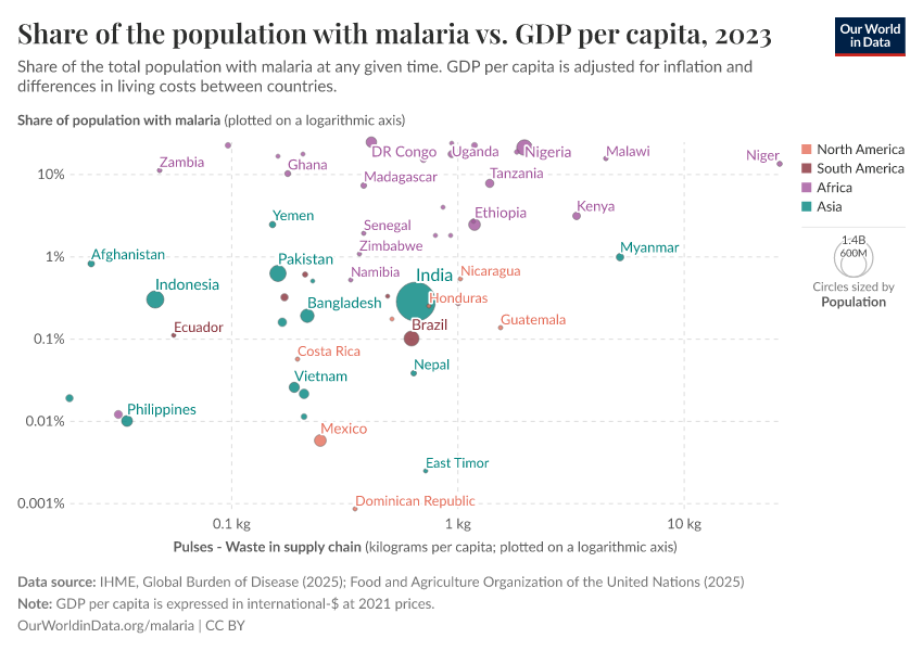 In the chart below, you can see each country’s prevalence of malaria compared to their GDP per capita.