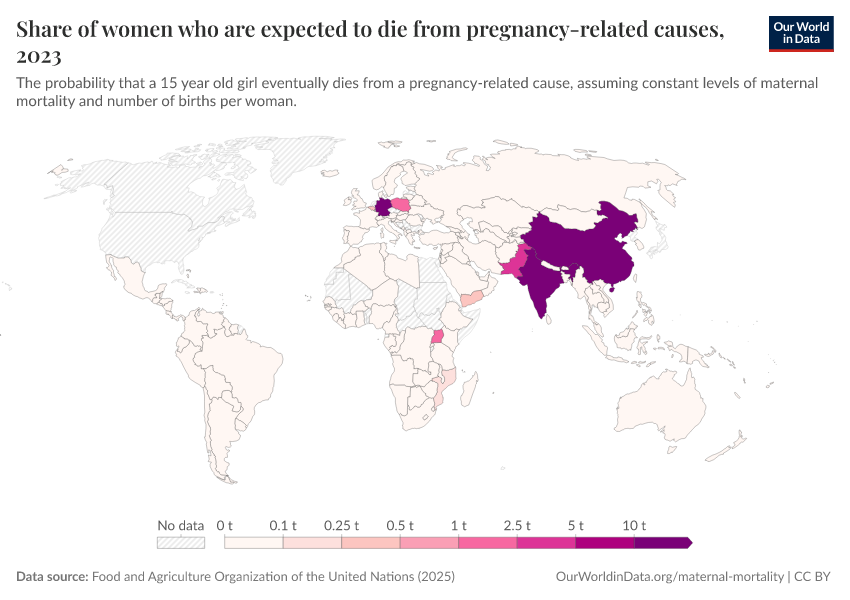 In the chart, we see estimates of the share of women who would die from maternal causes in their lifetime.