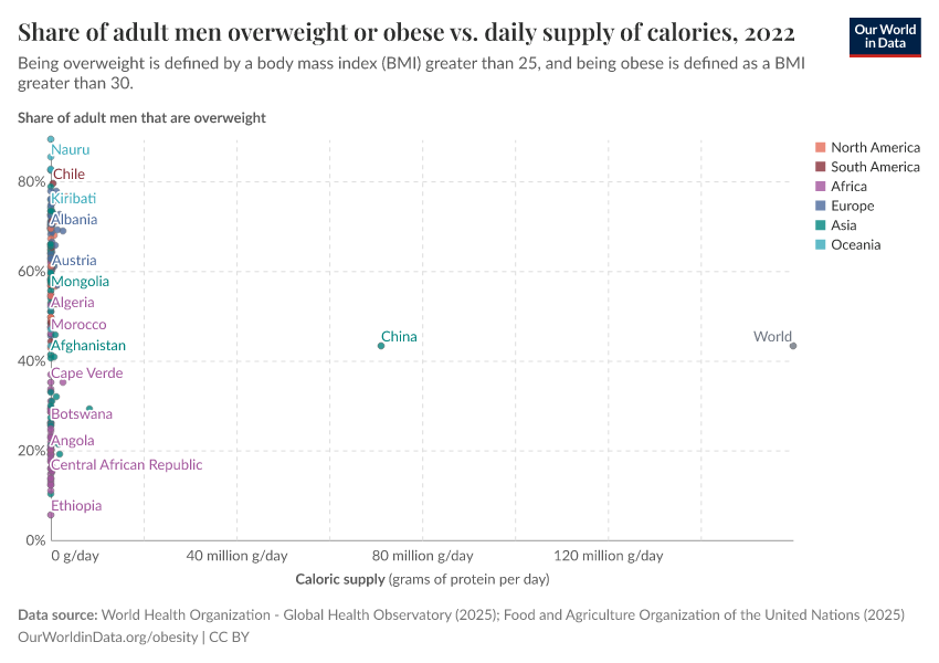 In the chart here, we see the relationship between the share of men who are overweight or obese versus the daily average supply of kilocalories per person.
