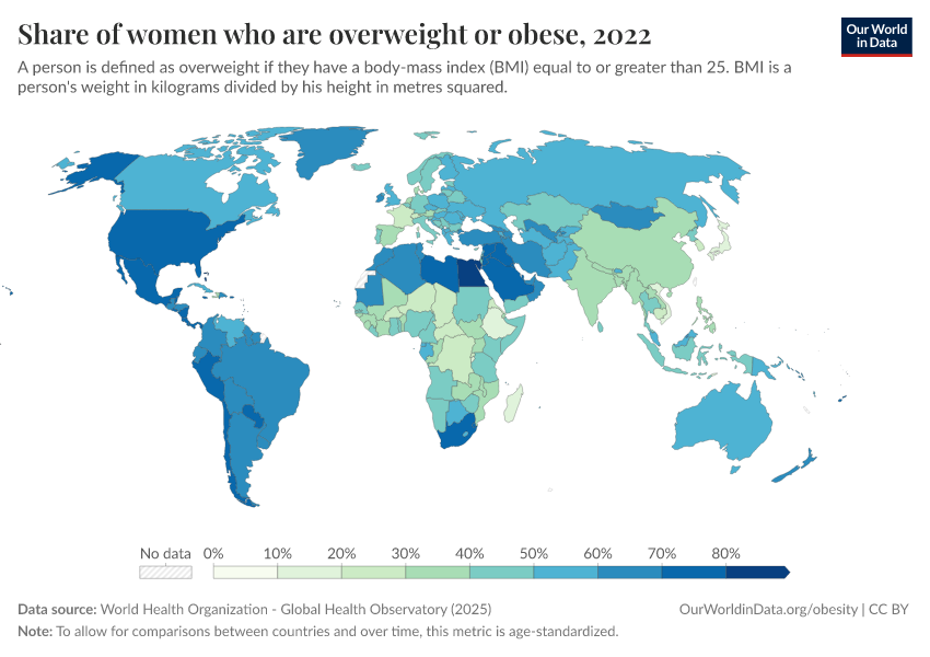 In 2016, the global average (mean) BMI in women was around 25, which is the cut-off for overweight. The average BMI tends to be higher in North and South America and North Africa, and lower in sub-Saharan Africa and Asia.