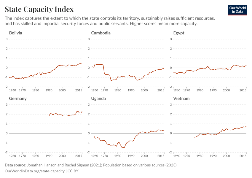 Bastian Herre and Pablo Arriagada (2023) - “State Capacity” Published online at OurWorldinData.org. Retrieved from: 'https://refactor-hide-legend.owid.pages.dev/state-capacity' [Online Resource]BibTeX citation