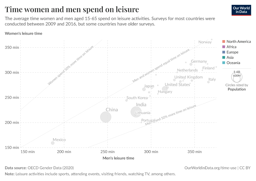 As we can see, in all countries the average leisure time for men is higher than for women — all bubbles are below the diagonal line — but in some countries, the gaps are much larger. In Norway, the difference is very small, while in Portugal men report much more leisure time than women.