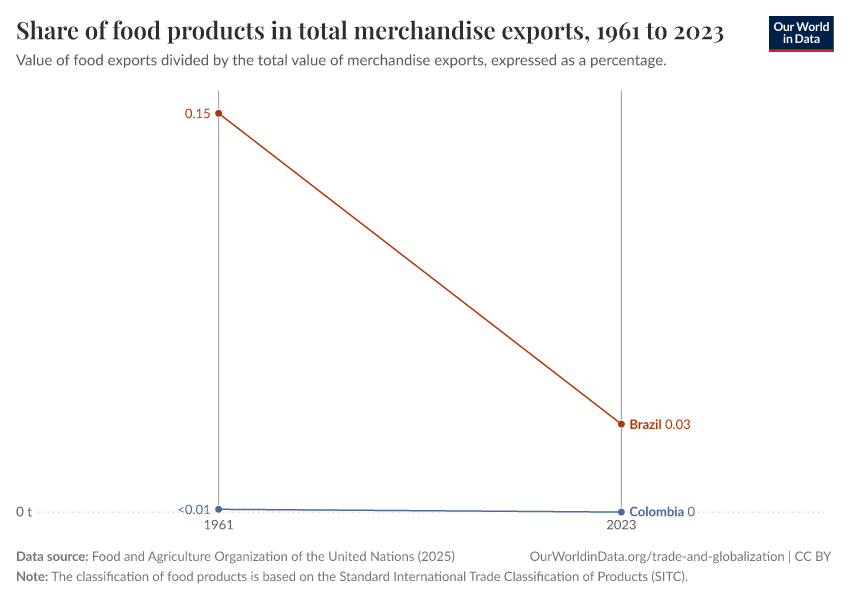 The next chart plots the share of food exports in relation to each country's total merchandise exports. These figures, published by the World Bank, correspond to the Standard International Trade Classification, in which “food” includes, among other goods, live animals, beverages, tobacco, coffee, oils, and fats.