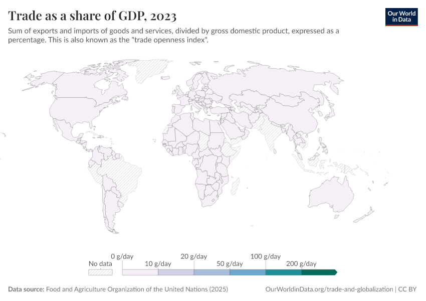 If you press the play button on the map, you can see how trade openness has changed over time across all countries.