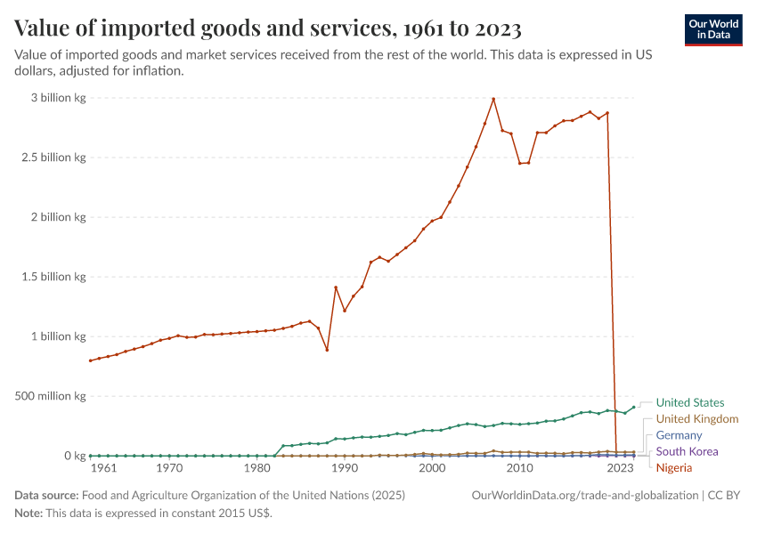 To understand how globalization looks today, we now turn from long-run historical sources to data that national statistical offices update regularly. These figures are derived from modern trade records, customs data, and international databases. With this data, we can track current patterns in trade volumes, trade composition, and trading partners. (You can read more about data sources and measurement issues at the end of this page.)