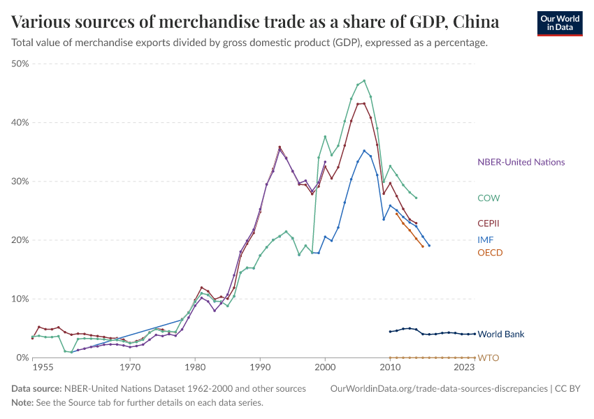 At Our World in Data, we have chosen to rely on CEPII as the main source for exploring long-run changes in international trade, but we also rely on World Bank, OECD, and IMF data for up-to-date cross-country comparisons.