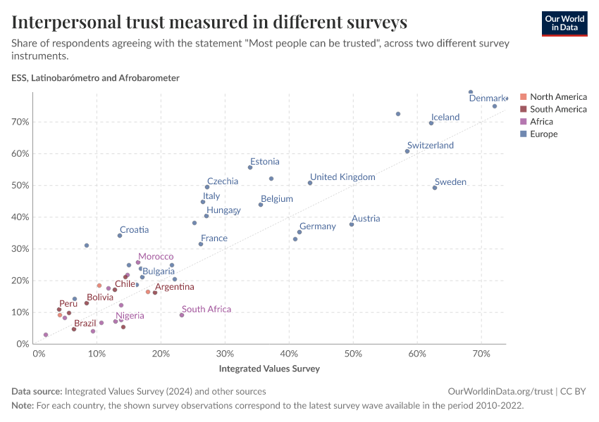 Esteban Ortiz-Ospina, Max Roser, and Pablo Arriagada (2016) - “Trust” Published online at OurWorldinData.org. Retrieved from: 'https://refactor-hide-legend.owid.pages.dev/trust' [Online Resource]BibTeX citation