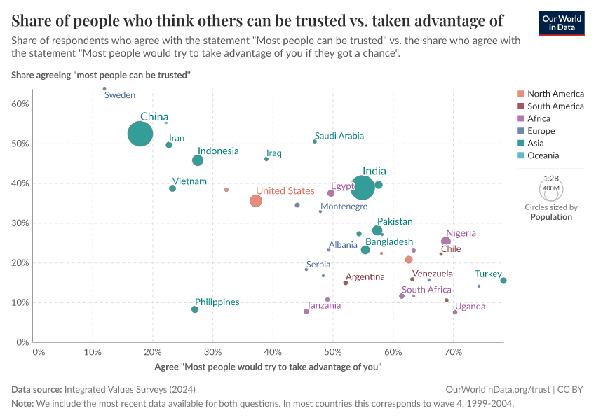 Our next chart illustrates this by comparing the percentage of respondents who agree with the statement "most people can be trusted" against those who agree that "most people would try to take advantage of you if they had a chance."