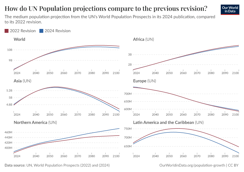 Hannah Ritchie and Lucas Rodés-Guirao (2024) - “Peak global population and other key findings from the 2024 UN World Population Prospects” Published online at OurWorldinData.org. Retrieved from: 'https://refactor-hide-legend.owid.pages.dev/un-population-2024-revision' [Online Resource]BibTeX citation