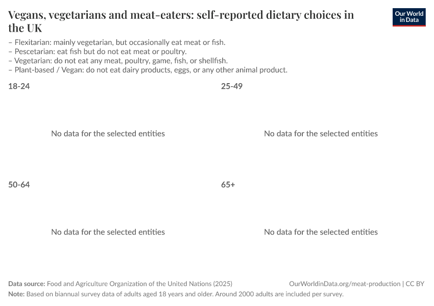 Edouard Mathieu and Hannah Ritchie (2022) - “What share of people say they are vegetarian, vegan, or flexitarian?” Published online at OurWorldinData.org. Retrieved from: 'https://refactor-hide-legend.owid.pages.dev/vegetarian-vegan' [Online Resource]BibTeX citation