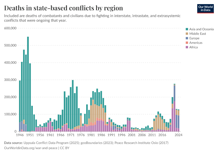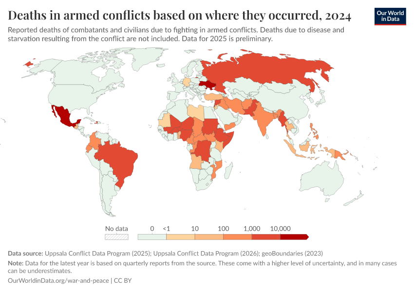 Bastian Herre, Lucas Rodés-Guirao, and Max Roser (2024) - “War and Peace” Published online at OurWorldinData.org. Retrieved from: 'https://refactor-hide-legend.owid.pages.dev/war-and-peace' [Online Resource]BibTeX citation