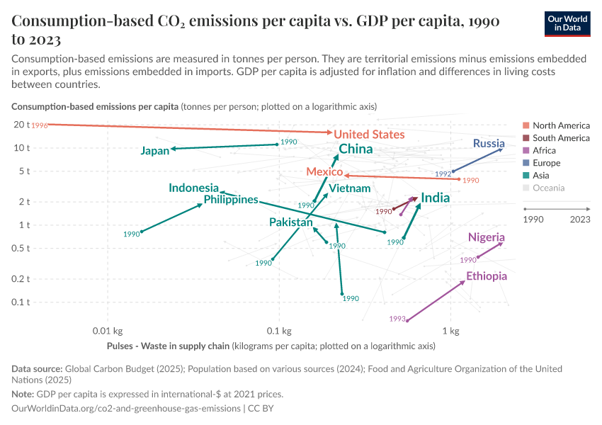 By default, the chart shows the change of income and emissions for the countries that are home to more than 100 million people, but you can add other countries to the chart.